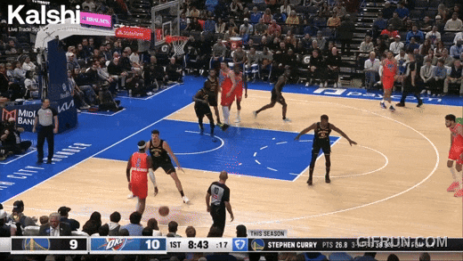 弱侧底角,库明加被放空,雷霆留一个人在禁区里。即,某个瞬间,雷霆四双眼睛看着库里。库里只能撤步强投——这球还亏理查抓到了前场篮板,但,依然。